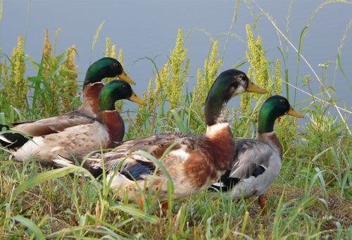 翌朝は早く目が覚めたので、温泉でひと汗流した後、 付近を流れる合志川(菊池川水系)の土手沿いをそぞろ歩くことに・・・・。 川原の草むらや中洲などを集団で闊歩するカモの姿が至るところで見られる。 こちらのカモは、毛づくろいに夢中。 土手から川原…