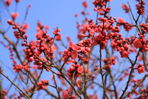 本殿に向かって一番左の紅梅(『皇后の梅』の隣)は、ふっくらとした花を咲かせます。