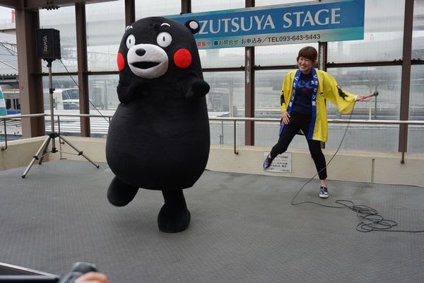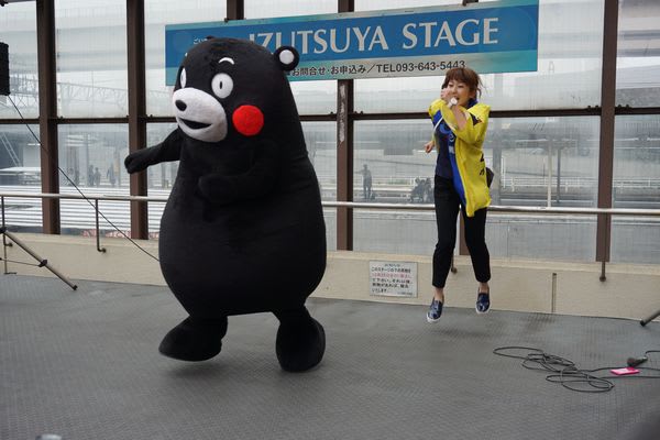 踊って踊って、熊本をアピールするサプライズくまモン。