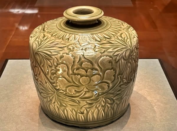瓶の肩から胴にかけて描かれているのは牡丹唐草の文様。深く彫られた部分に青磁釉が溜まり、文様に美しい陰影を与えています。北宋時代の耀州窯青磁を代表する世界的に知られた名品とのことでした。