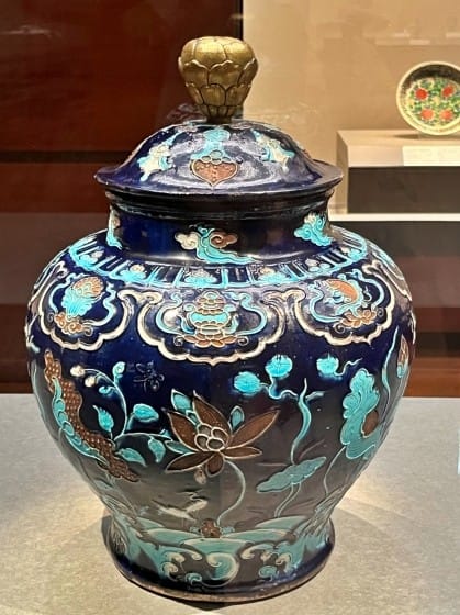 地に藍釉を用い、胴部には蓮華文を中心に、波濤文様と白鷺文様があしらわれた蓋つきの壺。蓮華文の花など、文様の一部に白檀塗りが施されています。