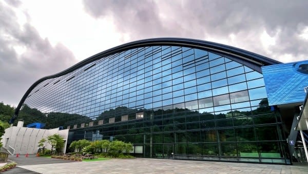 太宰府天満宮に隣接する丘陵に建つ九博は、なだらかな曲線を描くチタン製の大屋根と、深く濃い藍色のグラスウォールが印象的な建物です。この日はあいにくの曇り空で、ガラスに映りこむ空と雲、樹木の緑が今ひとつ冴えませんが、晴れた日には周囲の自然と壁面が一体化して、この大きな建築物が自然に溶け込んで見えます。