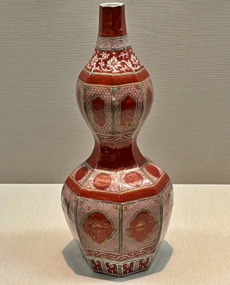 八角に面取りした瓢形瓶の全面に、赤、黄、緑の絵の具で文様を施し、赤地部分には更に金彩が加えられています。「金襽手」とは、五彩磁器に金彩を加えて豪華絢爛な装飾を施したものを言います。