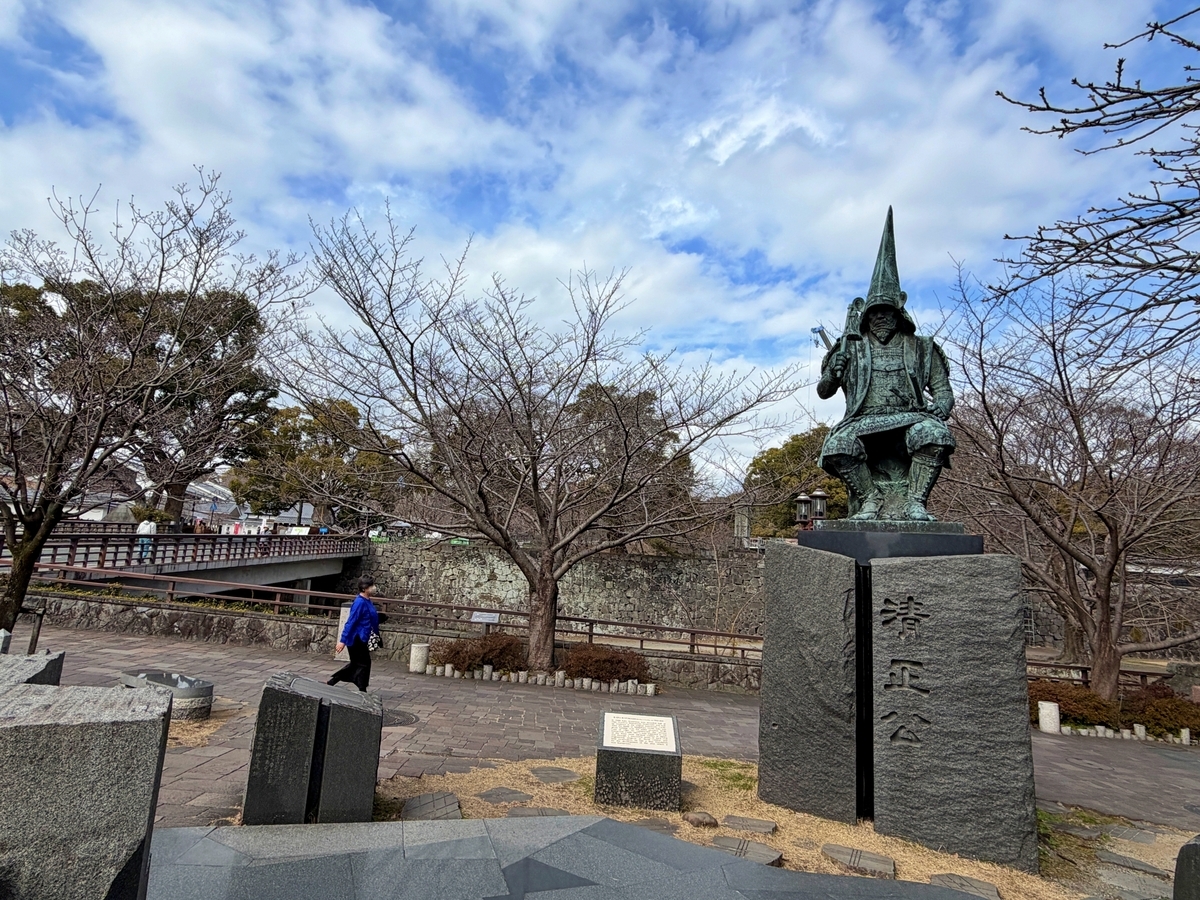その行幸坂の入口に建つ加藤清正公の像。甲冑と長烏帽子を身にまとい、さながら戦さの陣中で指揮を執っているようです。