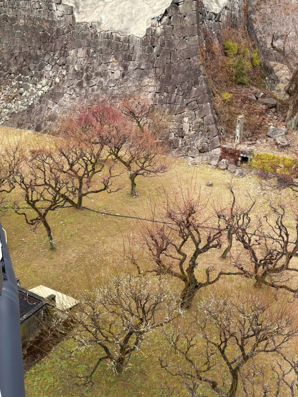 地上の道は通行できないので、空中回廊のような特別通路を通って天守に向かいます。人通りのない石垣のそばで咲く梅も、心なしか寂し気に感じられました。
