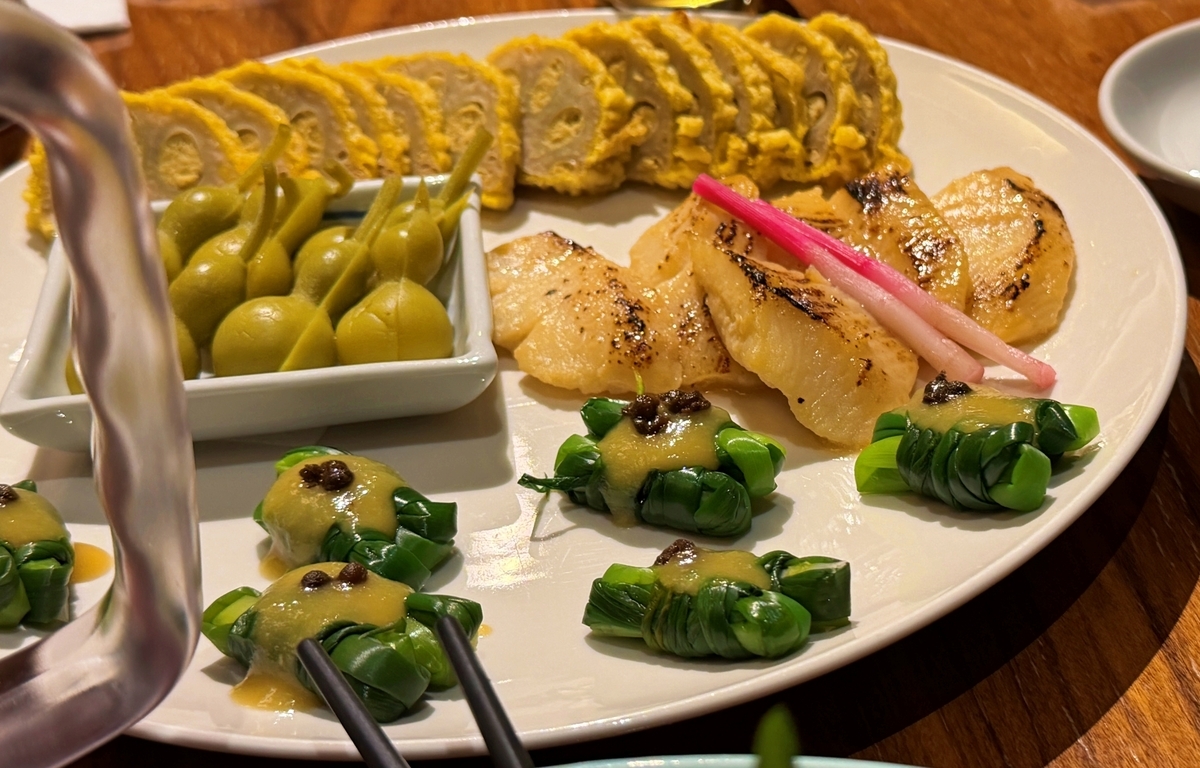 からし蓮根や一文字ぐるぐる(葱の一種「一文字」をさっと茹でて、白根を芯にしてねぎを巻き付けたもの)などなど。