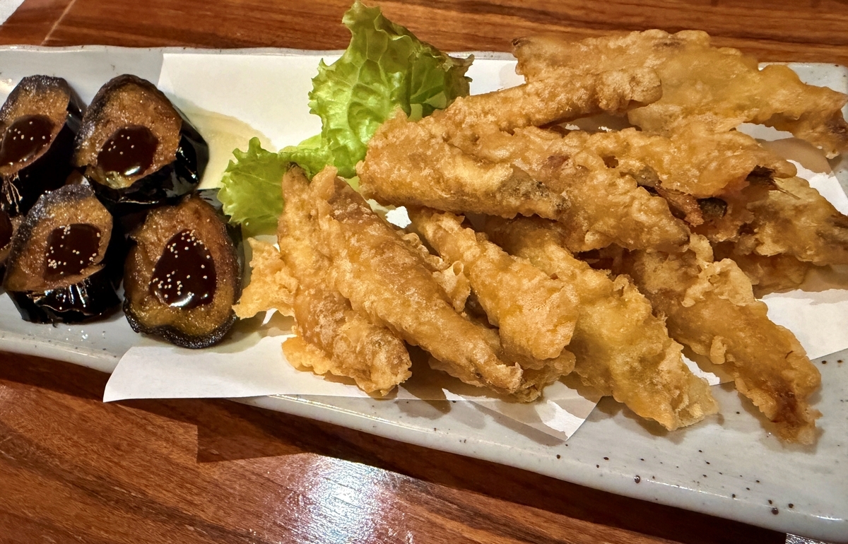 サクッと揚がった小魚の天ぷらと揚げ茄子の田楽。