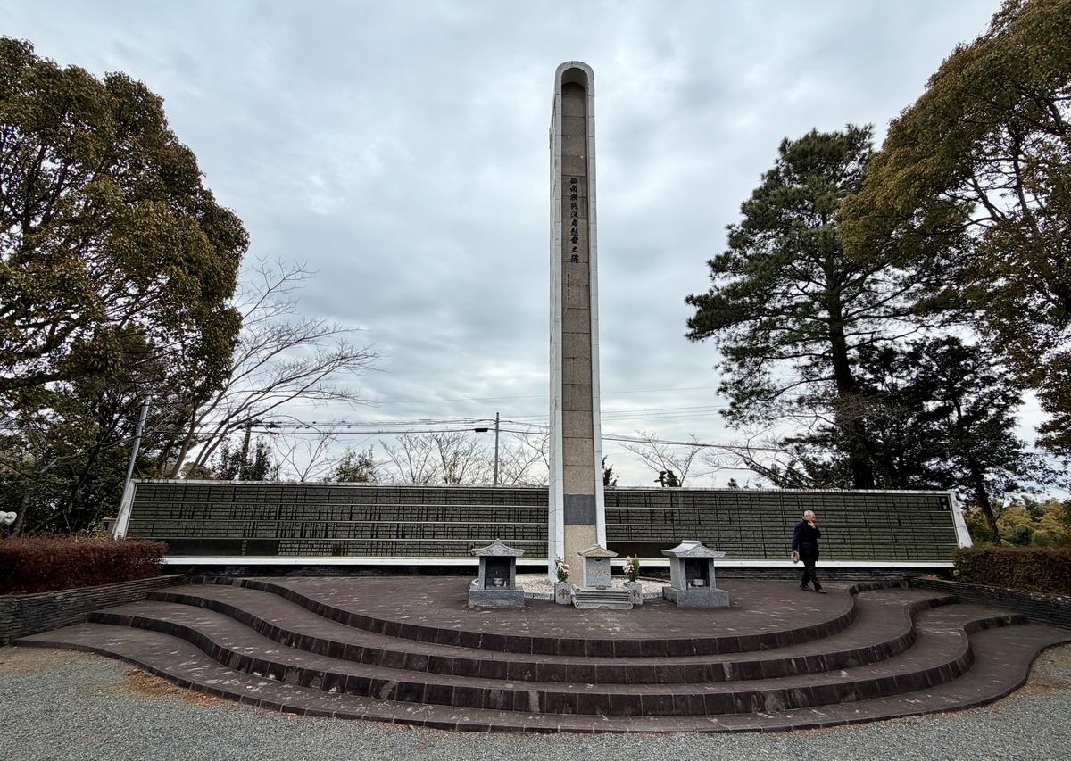 資料館の裏手に建立された戦没者慰霊碑。西南戦争では、薩軍7,186名、官軍6,923名、民間人29名の命が失われました。後ろの石碑には、ほぼ全ての戦没者の氏名が刻まれています(完全には把握できていないそうです)。
