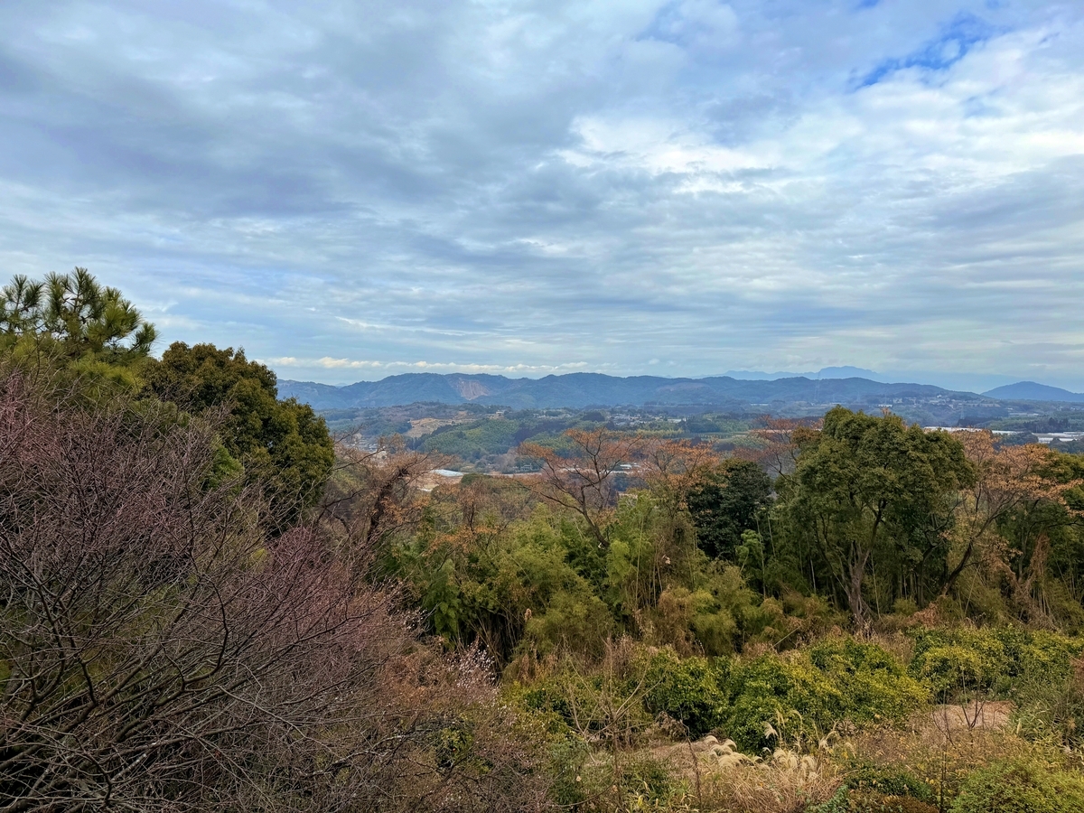 田原坂から、鹿児島本線が通る低地を抜け、政府軍が陣地を築いた二俣台地の展望台へ。わかりにくいですが、写真中央付近に見えているのが田原坂です。