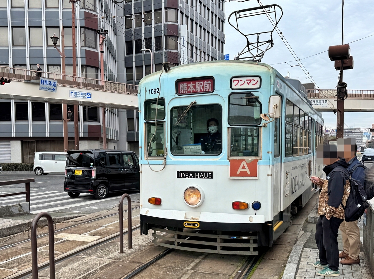 熊本駅からは市電A系統「健軍」行きに乗車。路面電車は200円の均一料金で、現金のほかSuicaやSUGOCAなど交通系ICカード、クレジットカードのタッチ決済やPayPayなどのQRコード決済にも対応していました。地元の方にはもちろん、旅行者にも便利なシステムですね。